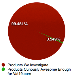 To help visualize our pickiness, please refer to the very un-scientific pie chart. See that tiny sliver of green? That's the good stuff - the "curiously awesome" stuff. It's hard to find unless someone (like Vat19) searches it out for you.