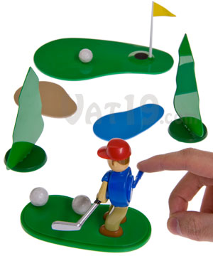 Design and master your own desktop golf course with the Chip Shotz Golfer. Push the golfer's spring-loaded handle to play this addictive office boredom-killer.