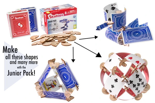 Combine multiple sets for truly impressive designs. Each set of Skallops includes a pack of playing cards and 52 wooden connectors. Please note that Skallops are compatible with any standard playing card.