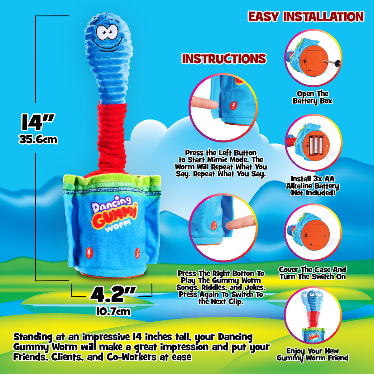 - Animatronic gummy worm that dances, sings, and mimics sounds