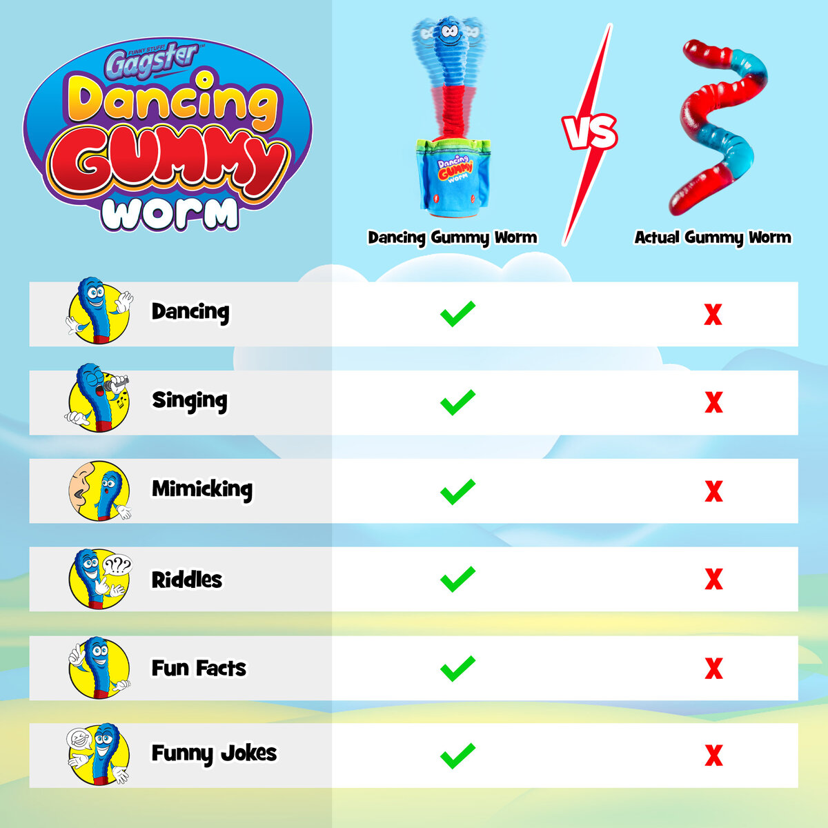 The Dancing Gummy Worm is preloaded with an array of songs, jokes, fun facts, and riddles, so he's always ready to put on a show. He can also mimic and repeat phrases, so watch what you say! He's perfect as a desk toy, but no matter how you use him, he's going to bring the laughs.
