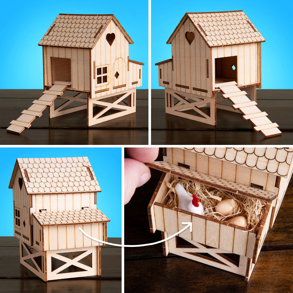 Chicken farming has never been easier! The 15 pre-cut pieces of this DIY kit effortlessly slide together, providing you with a glue-free miniature chicken coop in under ten minutes. The process will have you feeling like an authentic desktop farmhand, using your hands to turn real wood into a home for your miniature fowl.