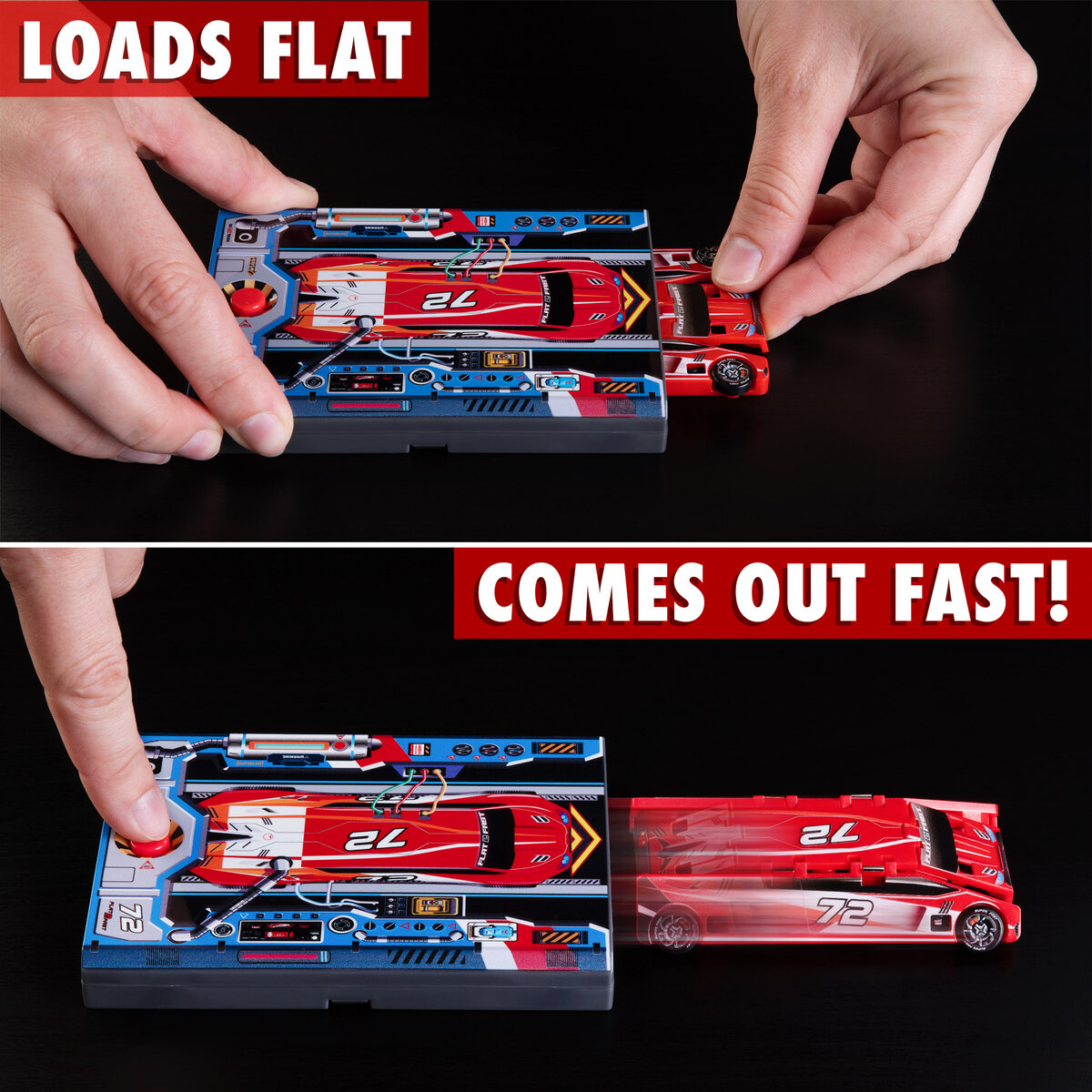These racers load in flat, but unfold into their car shape when fired with the button on the launcher. Use the speed to transform your floor, table top, or counter into a racetrack, or try propping up a book and see how far you can ramp!