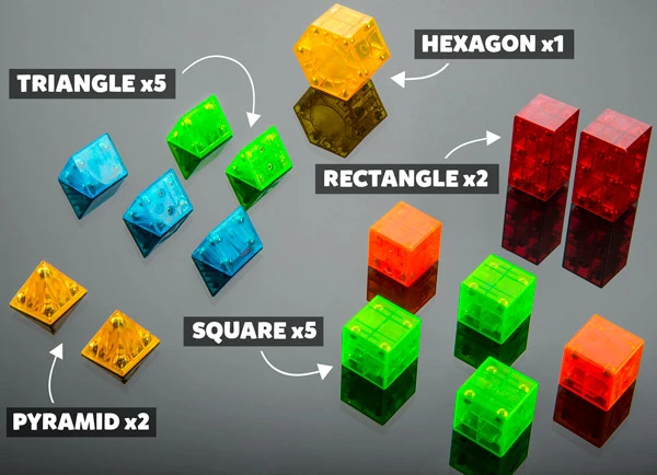 - 15 pieces per set: 2 x pyramid, 5 x triangular prism, 5 x cube, 2 x rectangular prism, 1 x hexagonal prism