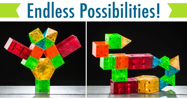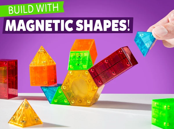 Each magnetic building block in the set houses a rare earth magnet inside each vertex, allowing it to easily align to and connect with any other block in the set.