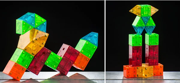 Since the magnets are spaced equally on each building element, your structures will always align to a grid for nice symmetry. And since the magnetic pull is stronger than the gravitational pull, you can build cantilevered structures that jut out wildly or suspend pyramids upside-down.