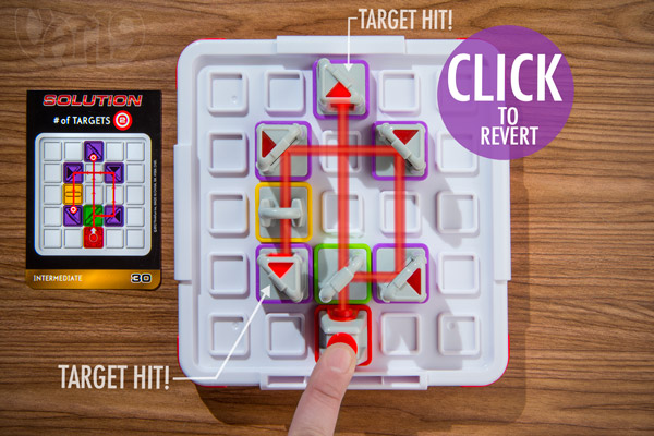 As the difficulty increases, the challenge card will provide fewer startup details. Laser Maze includes 60 challenges (15 each of beginner, intermediate, advanced, and expert puzzles).