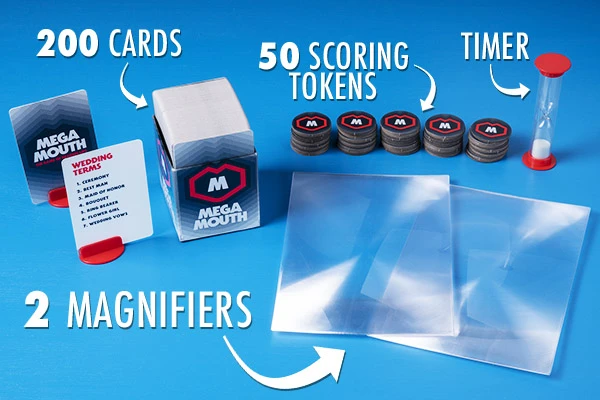 As with the classic game charades, the clue-giver can't say a word in Mega Mouth. But instead of pantomime, they're given a piece of magnifying material that makes their mouth mega-sized so that everyone can see as they silently speak the clue words.