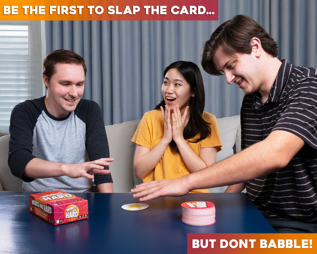 Rediscover the challenge of first-grade vocabulary with Words Are Hard, a lightning-fast card-slapping game that will leave players of all reading levels laughing!
