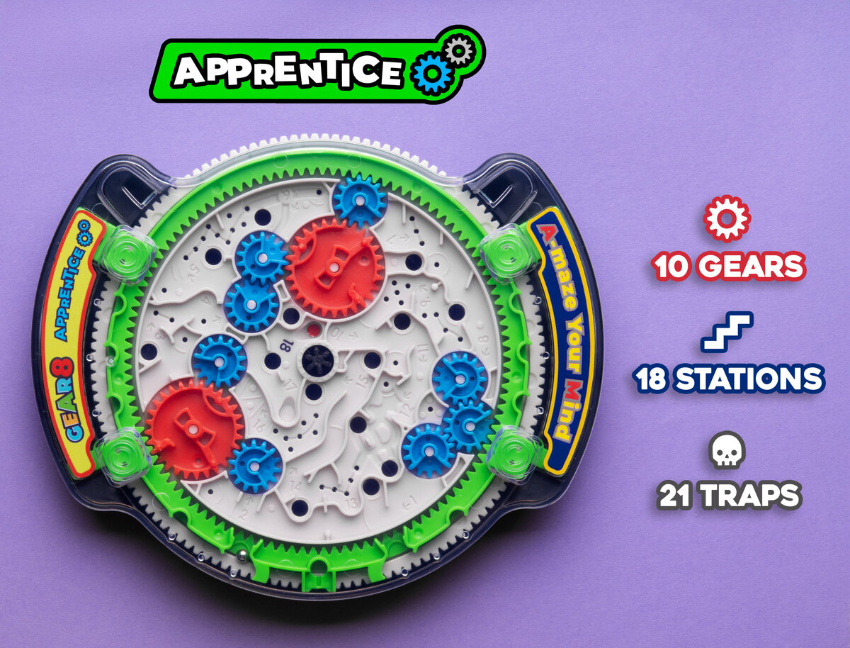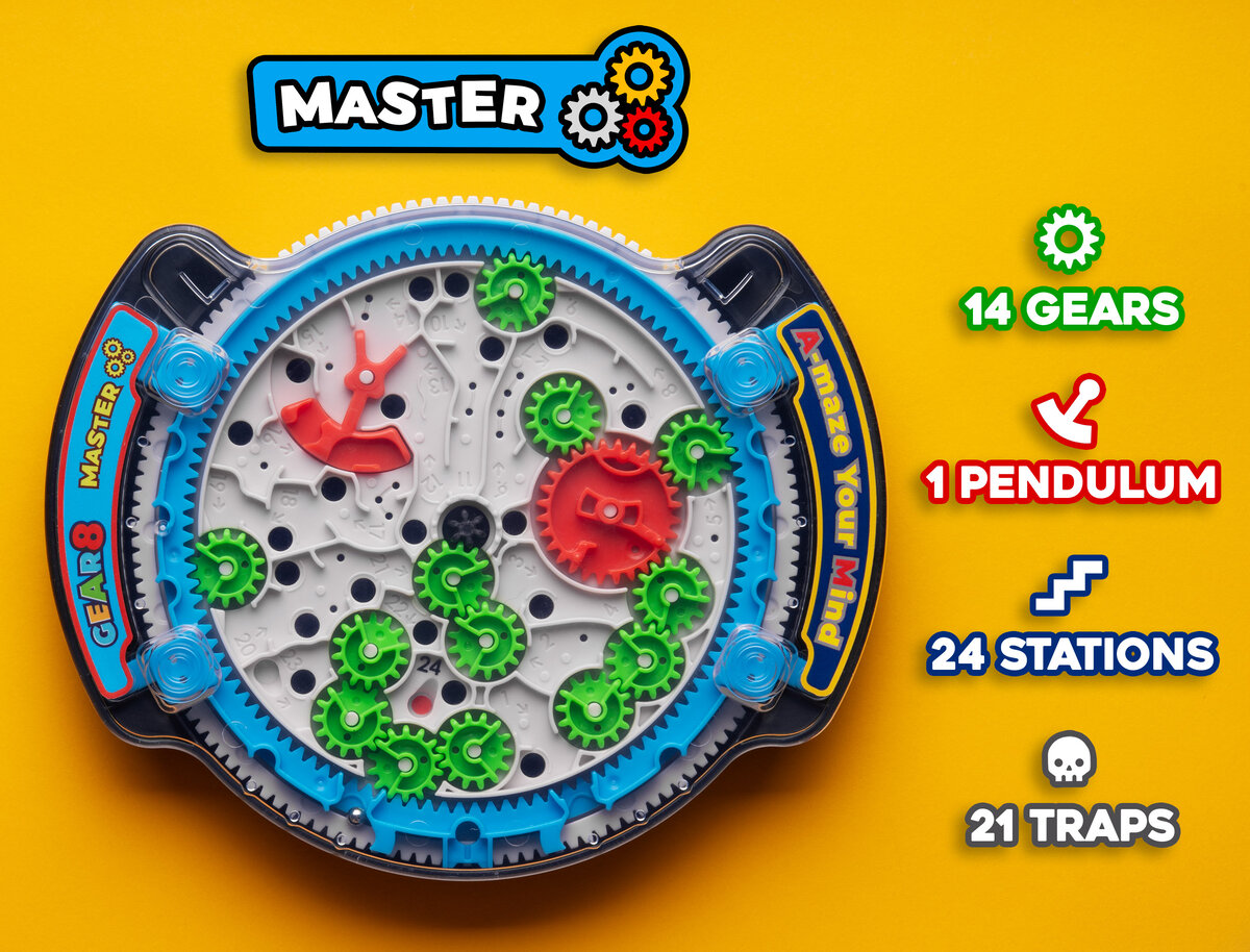 Enjoy a unique twist on marble challenges with Play-A-Maze Gear8 Puzzles! Featuring a rotatable gear at the center of each challenge, you’ll need critical thinking and a steady hand to conquer these trap-filled labyrinths!